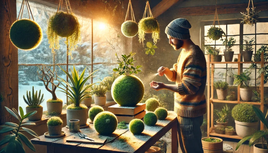Um dos principais fatores que considero ao cuidar de kokedamas no inverno é a umidade. No calor, a evaporação é rápida e as plantas demandam regas frequentes. No entanto, no inverno, o cenário muda. O ar tende a ficar mais seco, especialmente em ambientes internos que possuem aquecedores.
