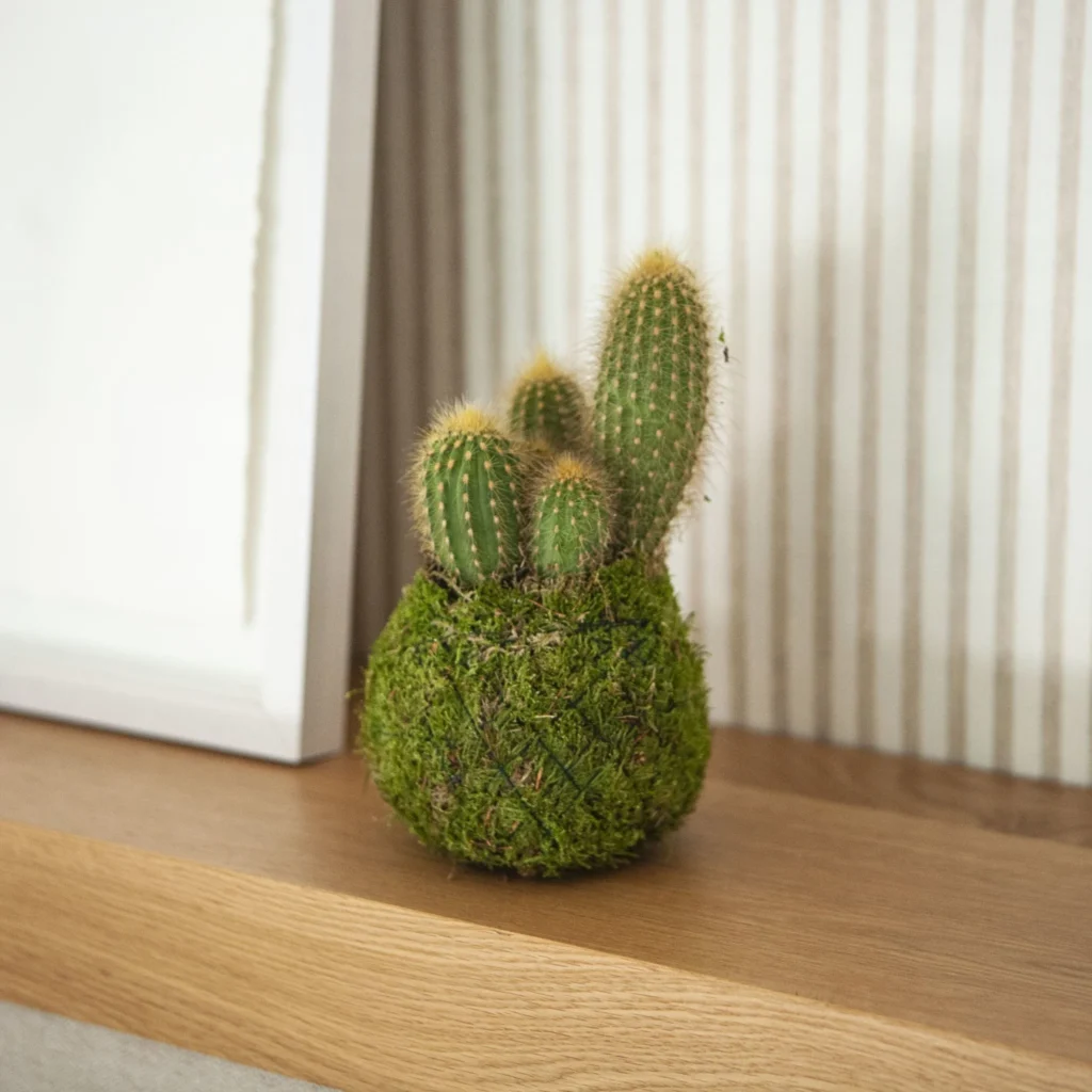 Cactos pequenos são uma escolha popular para quem quer um toque rústico e despojado. Eles requerem pouca rega e são incrivelmente resistentes. Adoro usá-los em kokedamas menores, que podem decorar mesas ou até mesmo prateleiras no escritório.